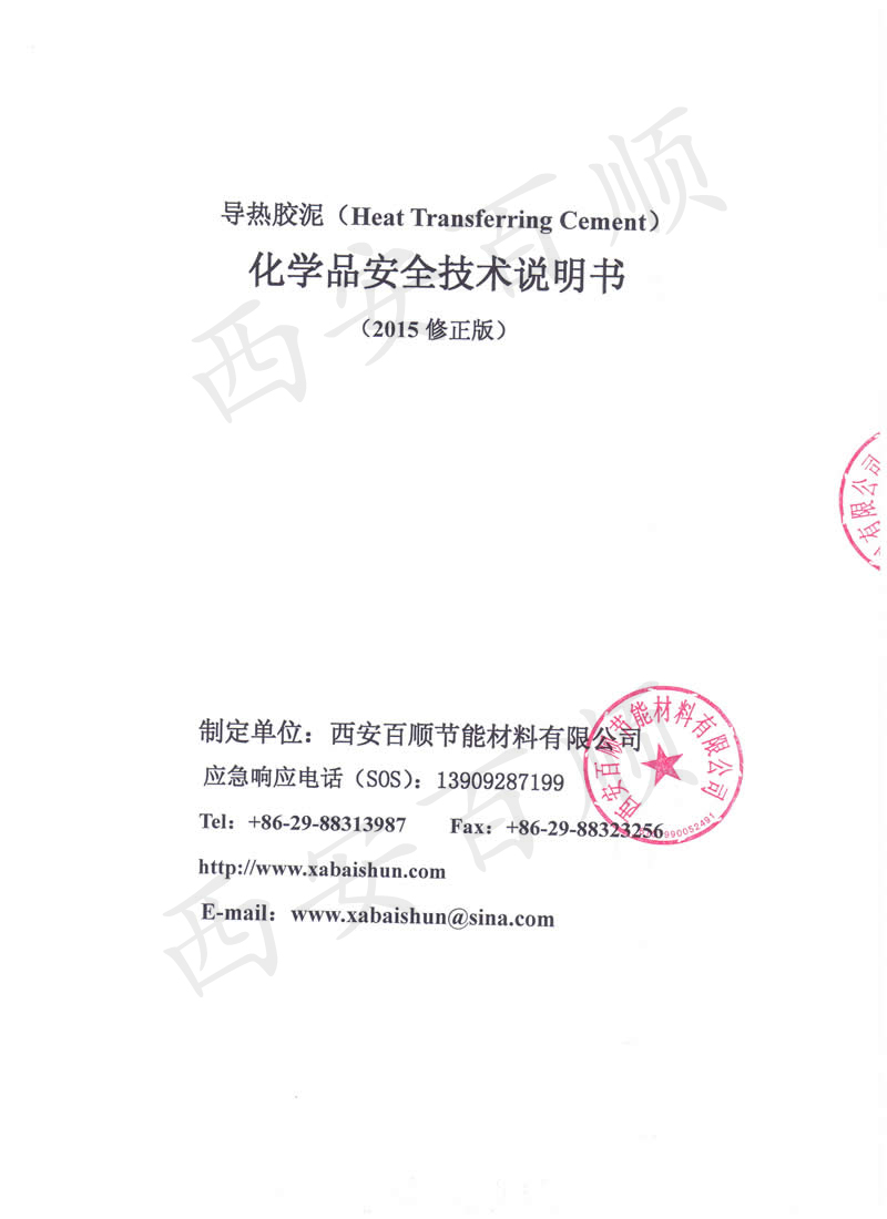 •        西安百順節能材料有限公司成立于1998年,二十五年來,我們專心、專注于導熱膠泥產品的研發、生產;企業通過ISO9001:2015質量管理體系認證,制定了Q/BS 001-2020《無機型導熱膠泥》企業標準,經過不斷的研發、優化,成功開發、生產、銷售了針對不同工藝、不同材質、方便施工的JM-250、JM-600、JM-800、JM-1000系列導熱膠泥,年生產能力2000噸;